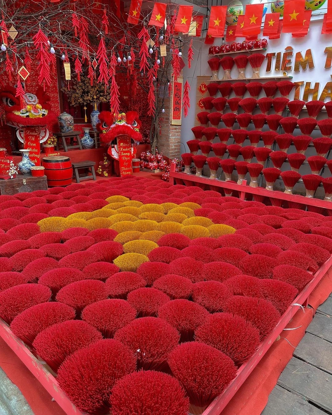 Quán cà phê nằm trên đường Nhất Chi Mai, quận Tân Bình, là một trong những địa chỉ quen thuộc thường xuyên mở cửa dịp Tết. Vào mỗi dịp lễ như Trung thu, Giáng sinh, năm mới, quán đều thay đổi phong cách trang trí. Năm nay quán trang trí làng hương truyền thống, xếp hình cờ đỏ sao vàng, xung quanh treo những câu đối, phong bao lì xì đỏ và các đồ trang trí Tết truyền thống. Ảnh: Tiệm trà tháng tư