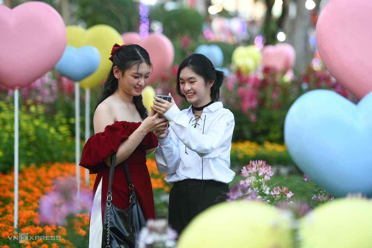 Phan Khải Hoàn (áo đỏ) học sinh cấp 2 đi cùng người thân đến công viên để chụp ảnh. “Năm nào gia đình em cũng đi chơi hội hoa xuân, năm nay thấy nhiều cảnh đẹp nên em cùng người thân chụp ảnh đăng lên mạng xã hội”, Hoàn nói.