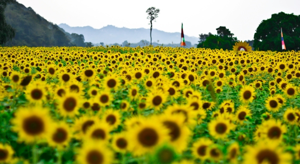 Rồi khi tạm rời xa những “người bạn lông lá” ấy, mình lại tìm về với một thiên đường khác, rực rỡ và lãng mạn hơn nhiều: cánh đồng hoa hướng dương. Lopburi được mệnh danh là “ngôi nhà” của những cánh đồng hoa hướng dương lớn nhất Thái Lan, và quả thật, khung cảnh ở đây đẹp đến nao lòng. Từ tháng 11 cho đến tháng 1 năm sau, cả một vùng đất rộng lớn bỗng chốc hóa thành biển vàng rực rỡ. Những bông hoa kiên cường, vươn mình đón nắng, tạo nên một bức tranh thiên nhiên tuyệt mỹ, khiến ai cũng muốn dừng lại thật lâu để chiêm ngưỡng và hít hà hương nắng gió.
